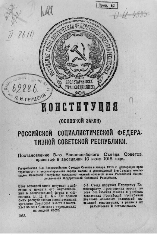 Constitution of the RSFSR - 1918Adopted by the Fifth All-Russia Congress of Soviets10 July 1918